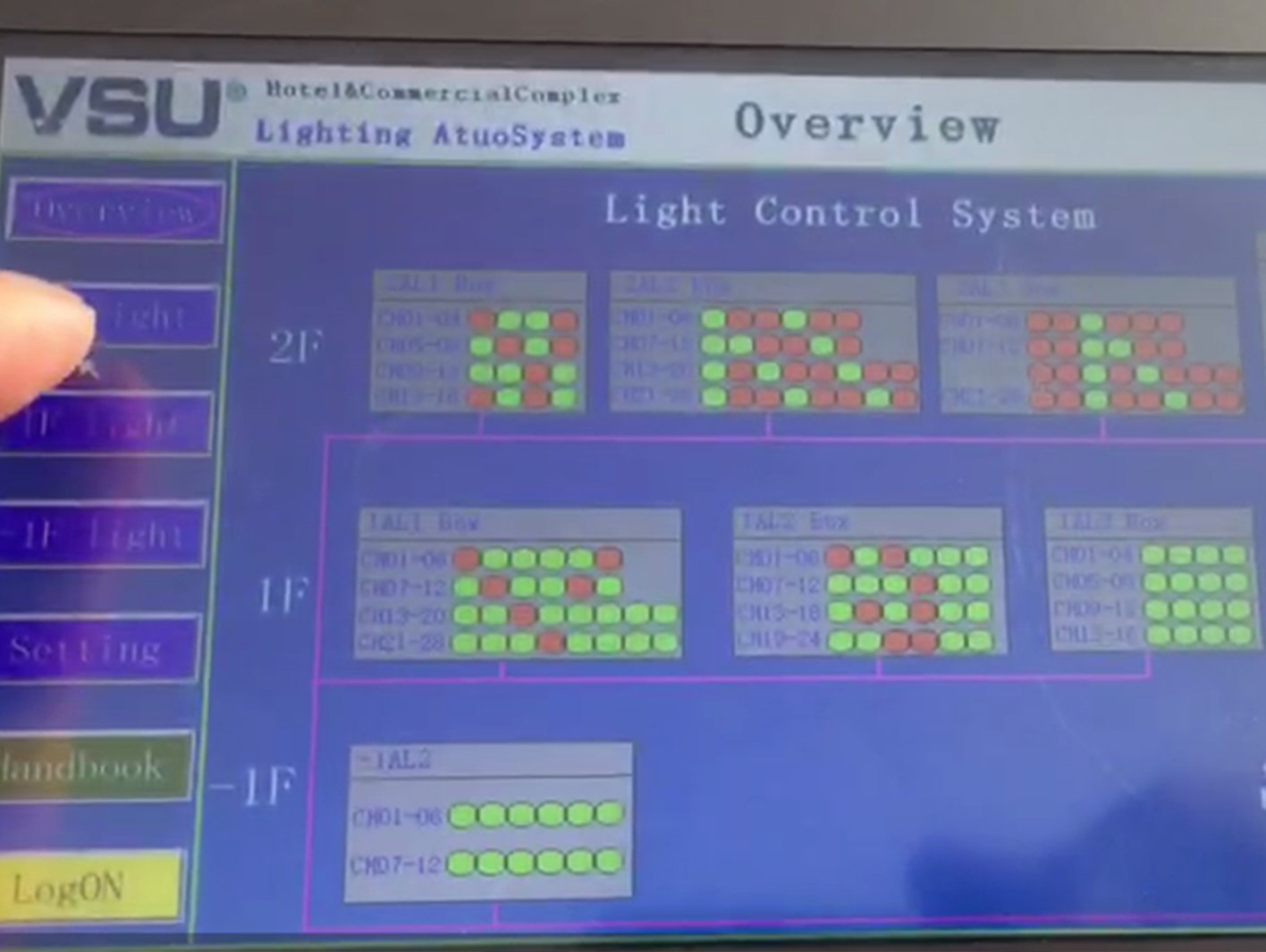 上圖為項目現(xiàn)場內(nèi)的電箱圖片,產(chǎn)品采用導軌式安裝,安裝簡單,普通電工即可完成。通過現(xiàn)場的觸摸屏可對控制終端任意操作,語言選擇中文/English,燈具單控全控,遠程操控。并且可以將建筑內(nèi)的燈具開關狀態(tài)了如指掌,避免疏忽管理,導致電能耗上升情況的發(fā)生。