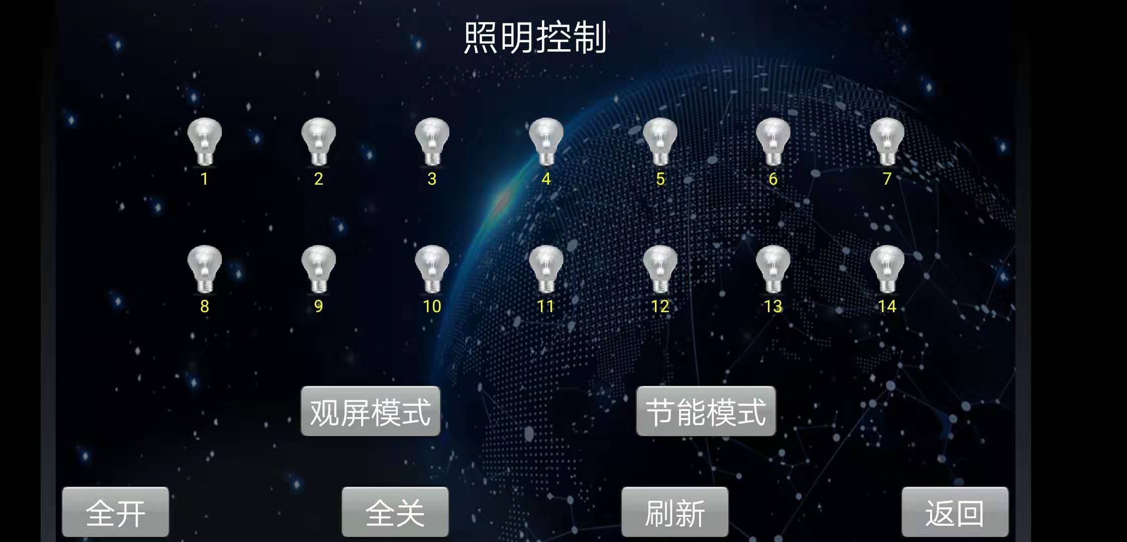 燈具:控制項目內(nèi)的所有燈光照明,每個燈光回路可實現(xiàn)單獨控制,并設(shè)計了多種控制場景,如觀屏模式、節(jié)能模式、全開模式、全關(guān)模式等,使燈光控制變得更加智能、更加便捷。