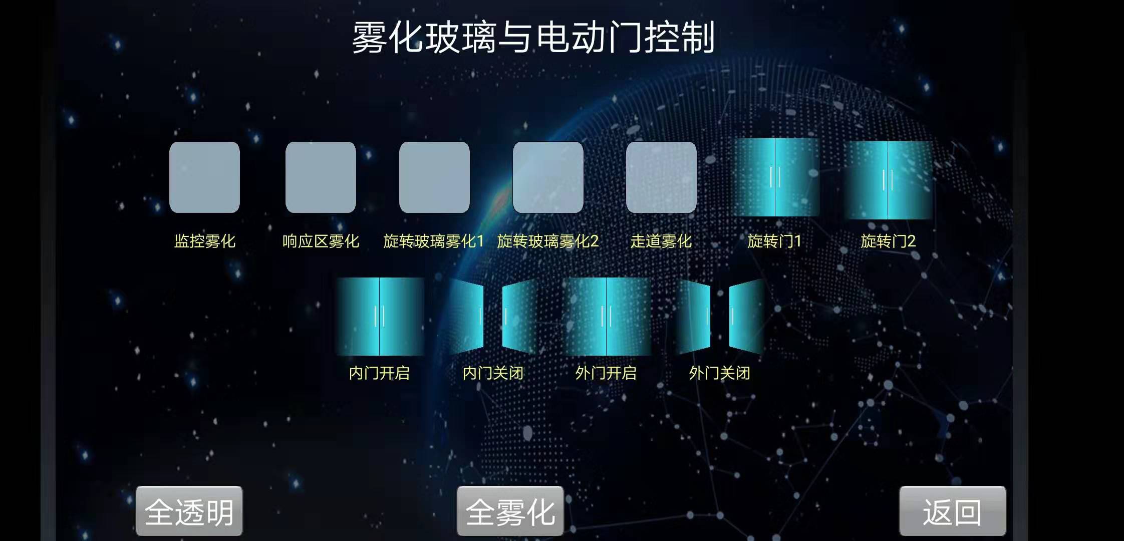 霧化玻璃與霧化玻璃門:調(diào)度中心有五組霧化玻璃,其中兩組為可旋轉(zhuǎn)霧化玻璃門。經(jīng)過技術(shù)對接以后,通過控制霧化玻璃的干接點信號,閉合則控制霧化玻璃門透明,斷開則控制霧化玻璃門霧化。旋轉(zhuǎn)門也同樣控制干接點信號,閉合則旋轉(zhuǎn)九十度,斷開則復(fù)原。