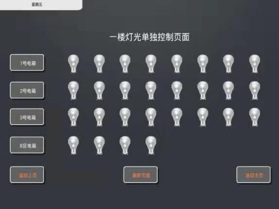 下圖為該項目的智能照明控制軟件截面圖,如圖所示,有電箱內的回路單控,也有以樓層為單位作區(qū)域燈光控制的選項,以及所有系統(tǒng)內的燈光一鍵全開全關的功能。