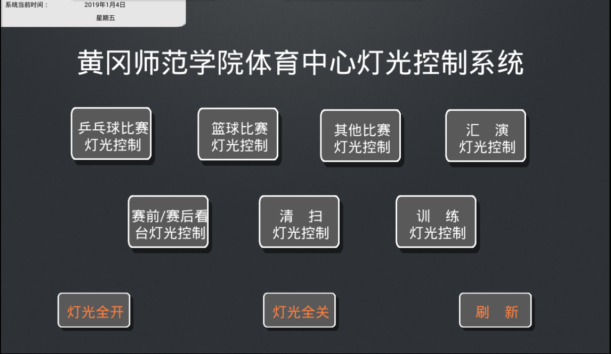 VSU為黃岡師范學院體育中心實現(xiàn)燈光智能化控制,多種燈光場景模式任意切換,一鍵開閉館內所有燈具。我司根據(jù)客戶需求設置了以下燈光場景模式:乒乓球比賽、籃球比賽、其他比賽、匯演、賽前/賽后、清掃、訓練、全開、全關。