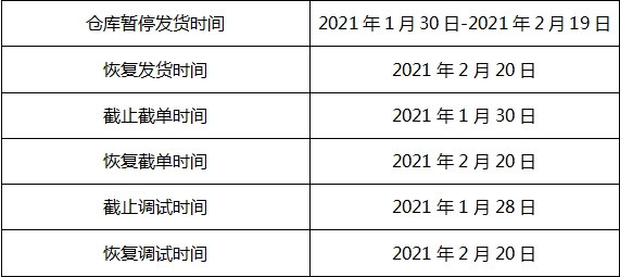 關(guān)于2021年春節(jié)期間倉(cāng)庫(kù)暫停發(fā)貨及項(xiàng)目調(diào)試暫停通知