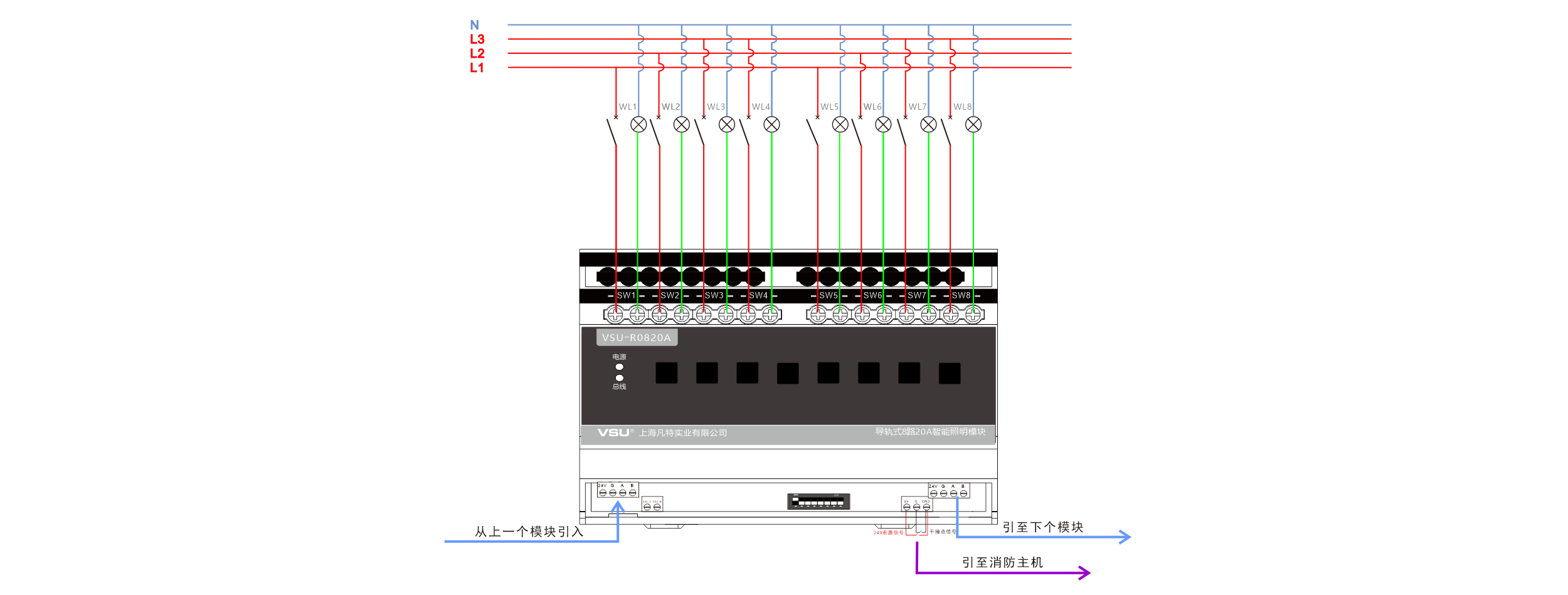 本產(chǎn)品為導(dǎo)軌式安裝,含8路智能繼電器,每回路可獨立控制4400W燈具的開關(guān),帶應(yīng)急按鍵,LED燈時時指示各個回路開關(guān)狀態(tài),可設(shè)置為互鎖控制4組窗簾開合;