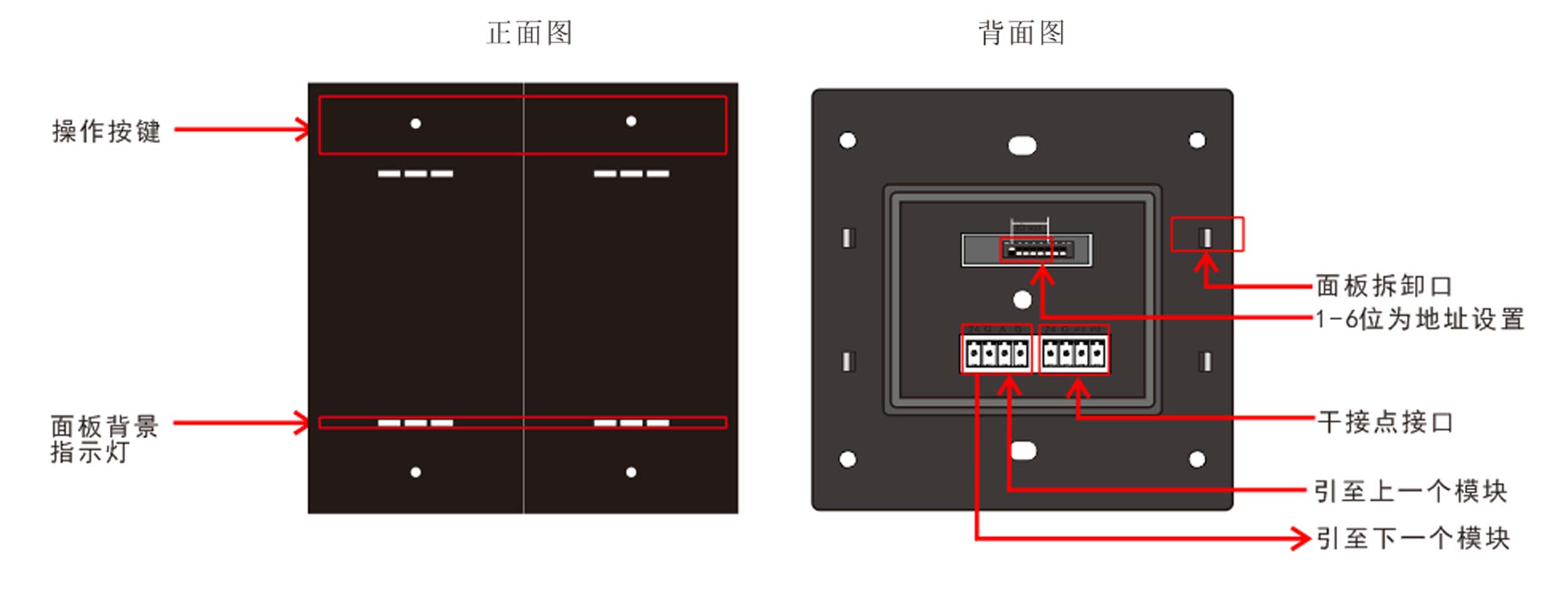 標準86底盒安裝,支持無縫聯(lián)接,提供4鍵,每個按鍵帶1路LED指示燈,復位式輕觸開關(guān),結(jié)構(gòu)成熟,性能穩(wěn)定,標準工藝,采用塑料材質(zhì)(顏色可選灰色、黑色和香檳金);自帶感應(yīng)式背光燈;提供兩路IO輸入可外接傳感器。
