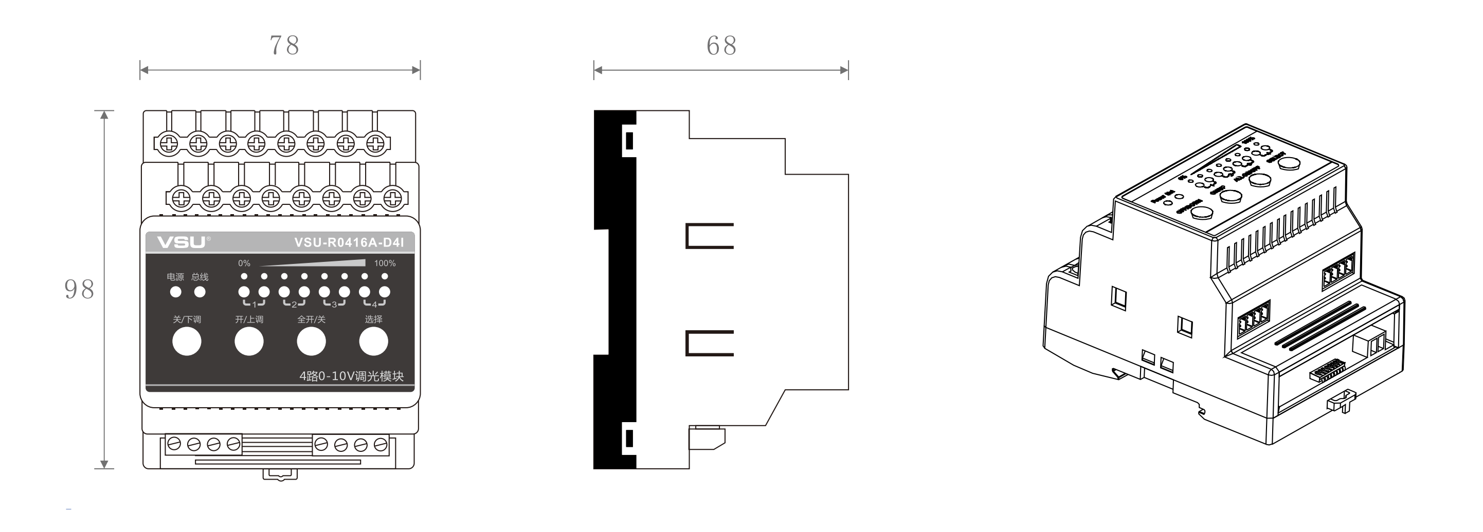 本產(chǎn)品為導軌式安裝,含4路智能繼電器可獨立控制4路3300W燈具的開關,4路0-10V調光接口配合0-10V調光變壓器可對日光燈、LED燈等燈具調光; |
